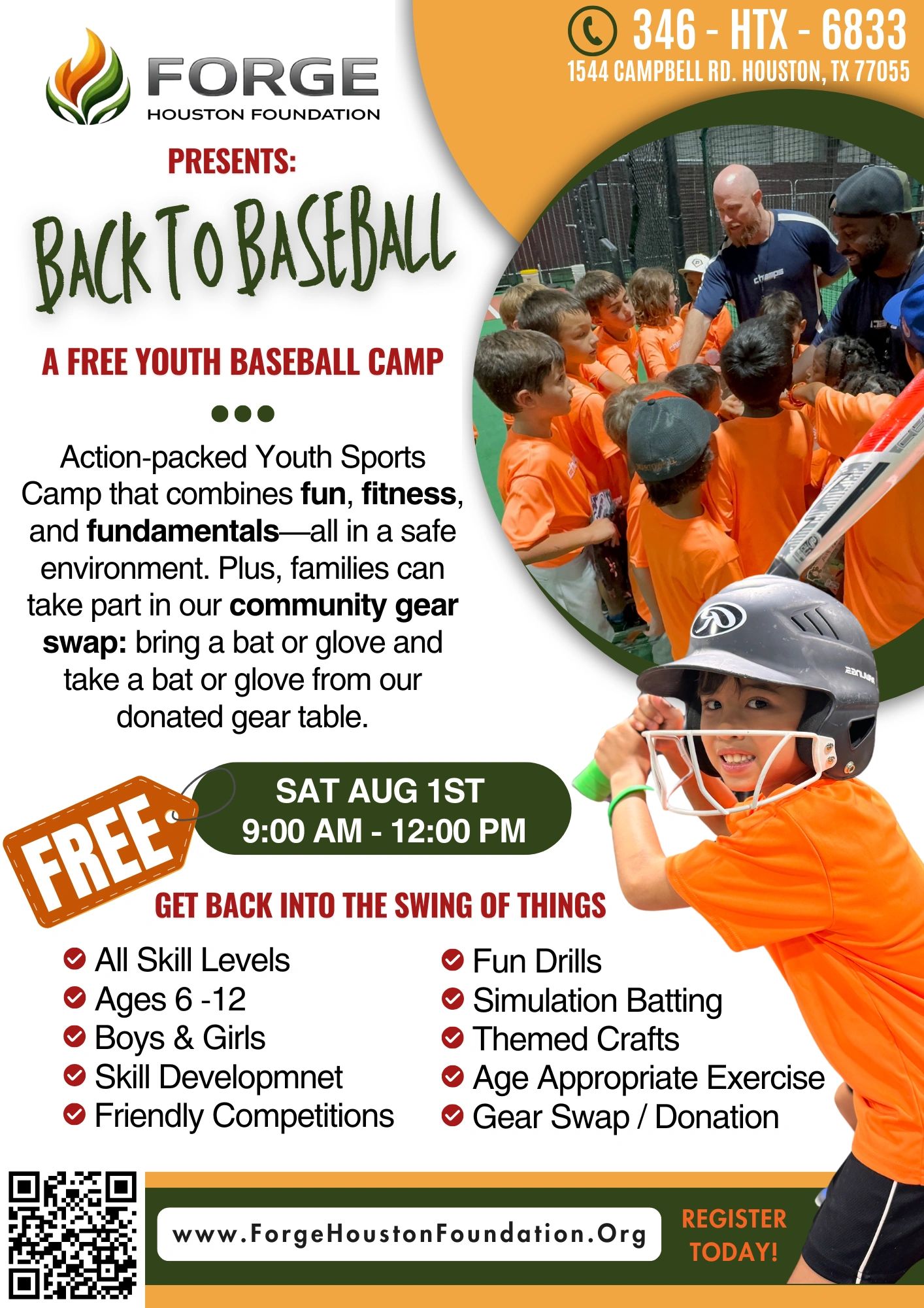 Back to Baseball is a free, action-packed 3-hour clinic for boys and girls ages 6–12. Join Forge Houston Foundation for an exciting end-of-summer event filled with fun, fitness, fundamentals, friendly competitions, and a community gear swap. Bring your helmet, bat, and water bottle, and get back into the swing of things with our coaches.